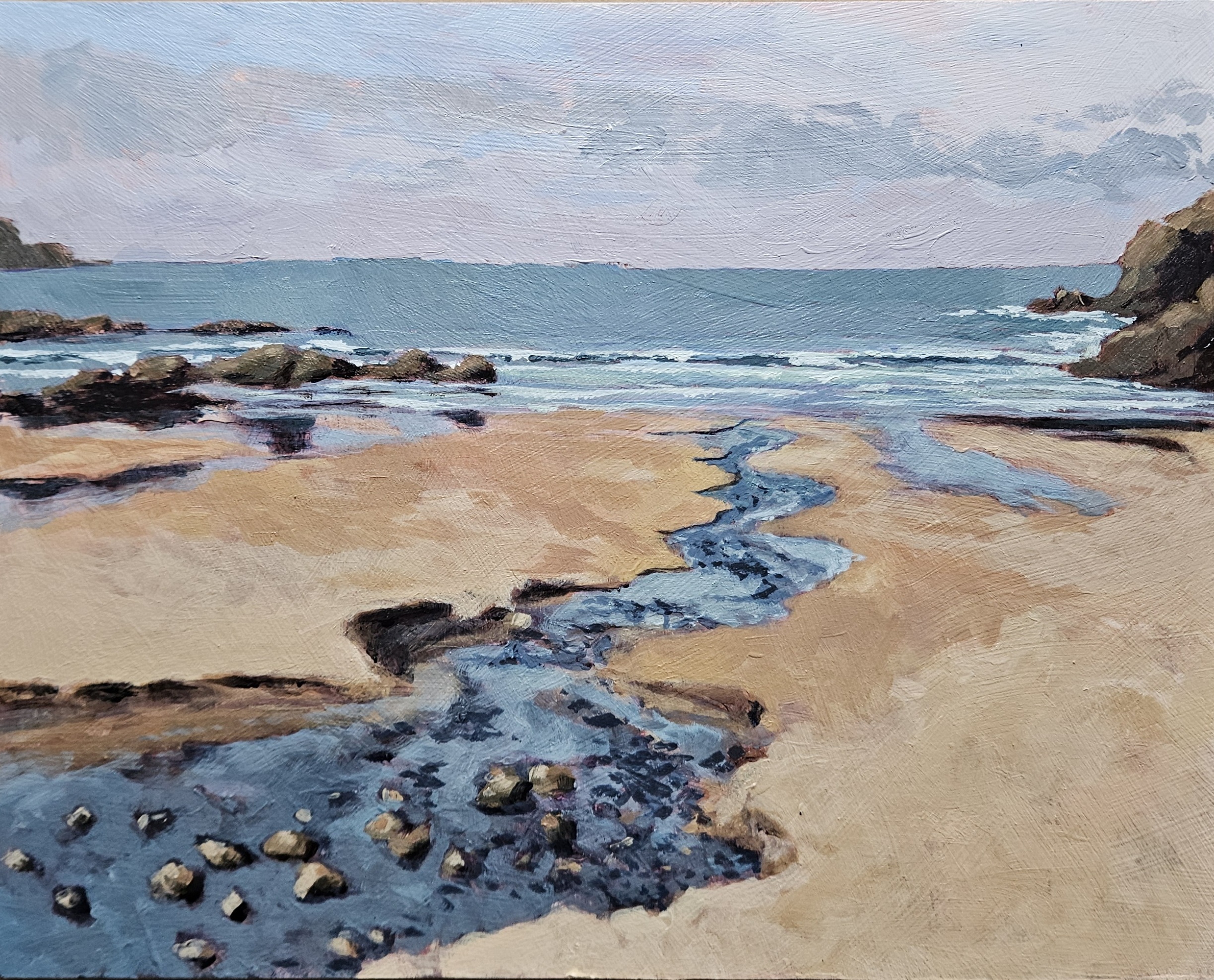 A fresh water stream running down Trevone Beach to the sea. Painted on the beach en plein air.